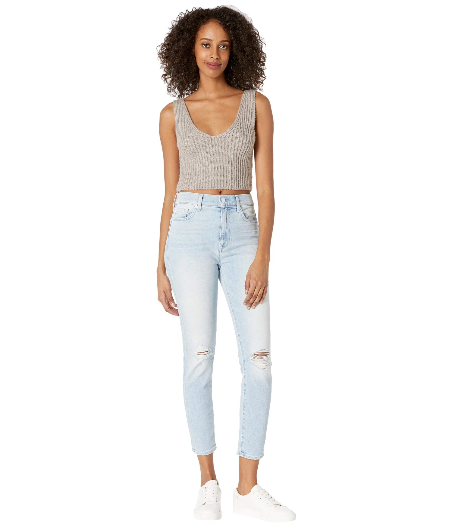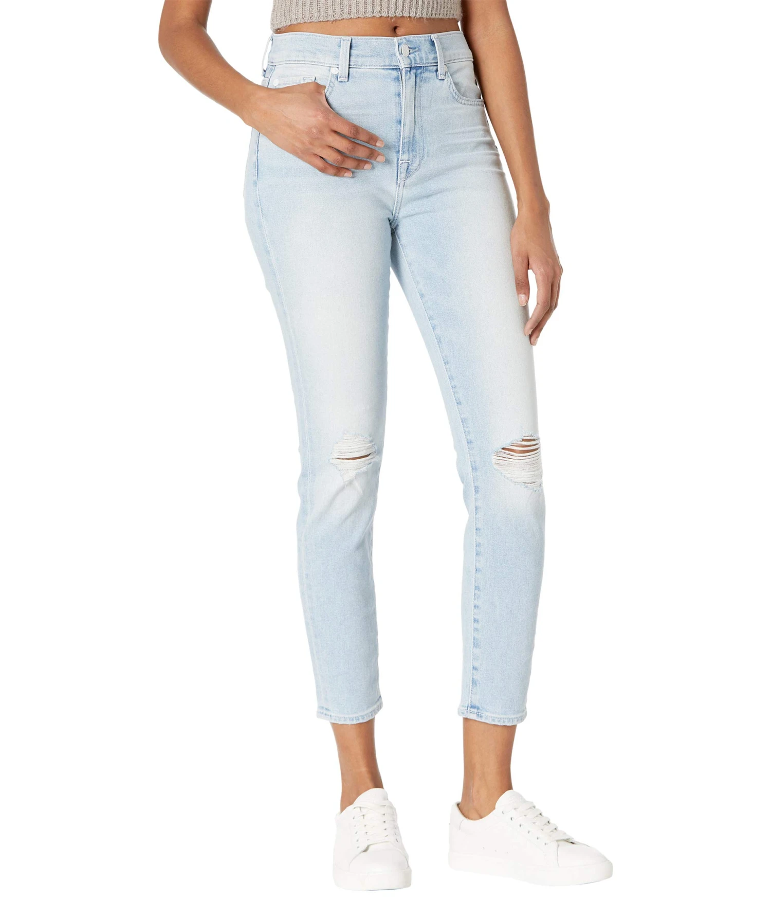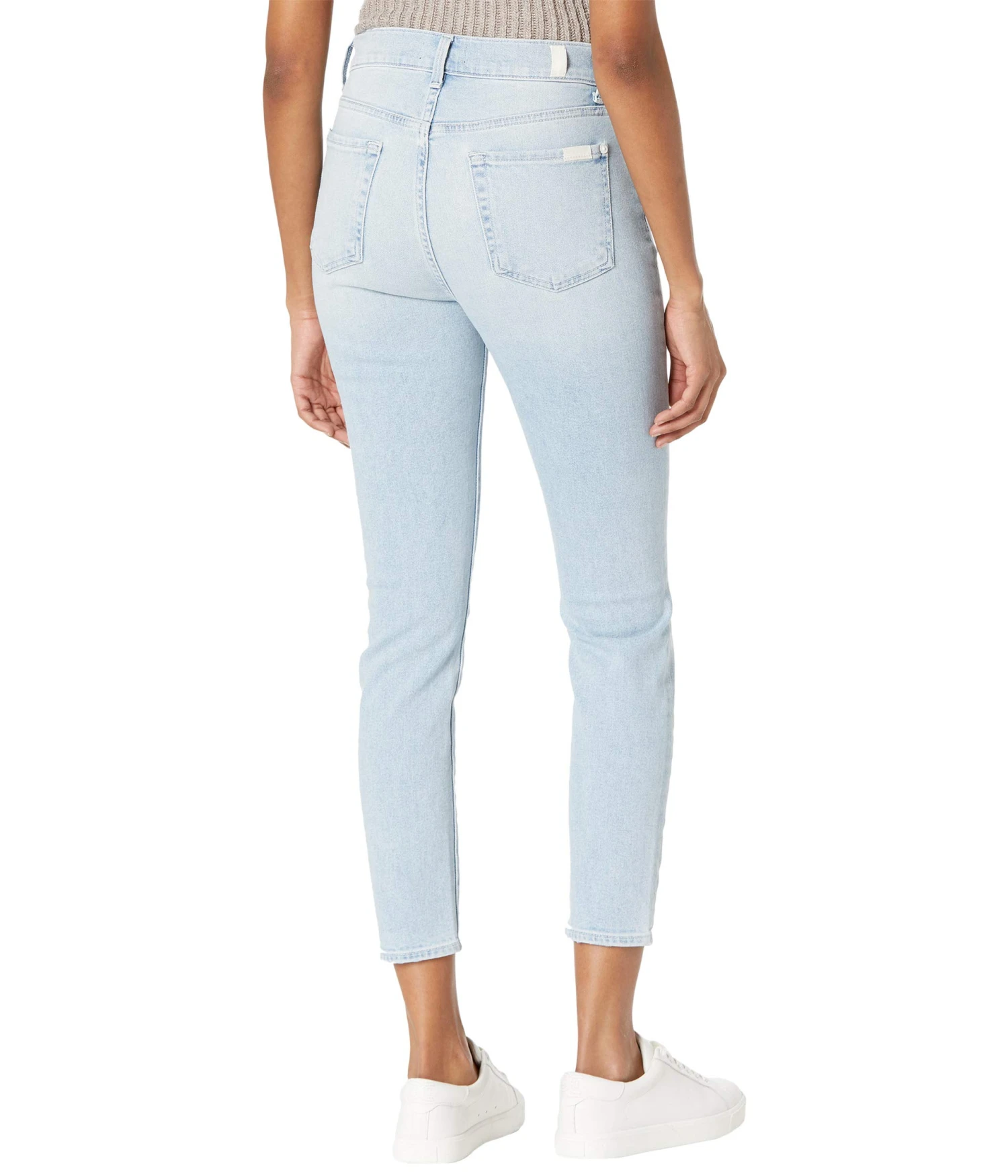 - Crafted for an all day comfort this 7 For All Mankind® The High-Waist Ankle Skinny in Beverly jeans features a high fitted waist with all around belt loops, zip-button closure, traditionally stitched five pocket, rip design on knees, and a skinny fit with an ankle-rise hem cut.