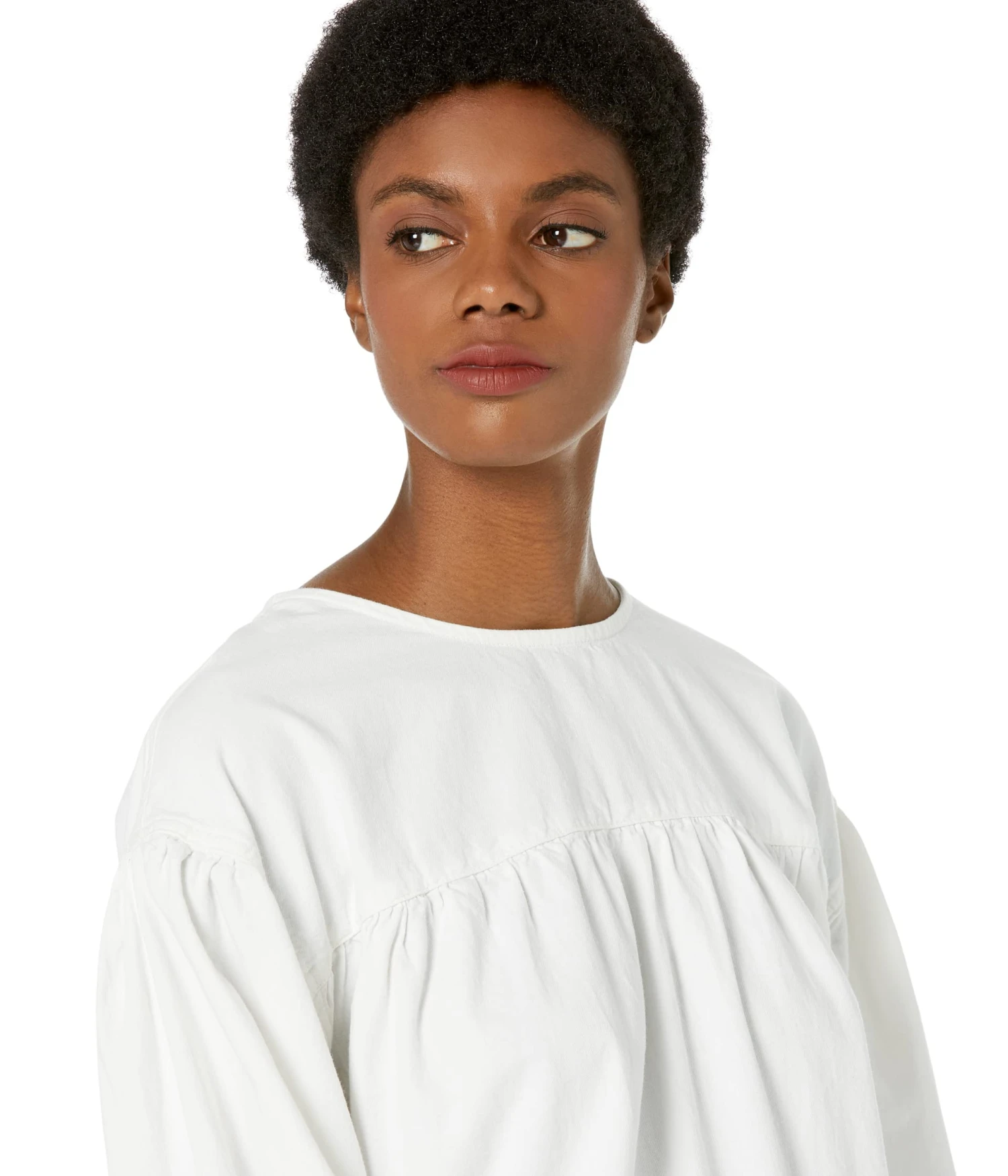 - Long set-in puffed sleeves with single button cuffs.
