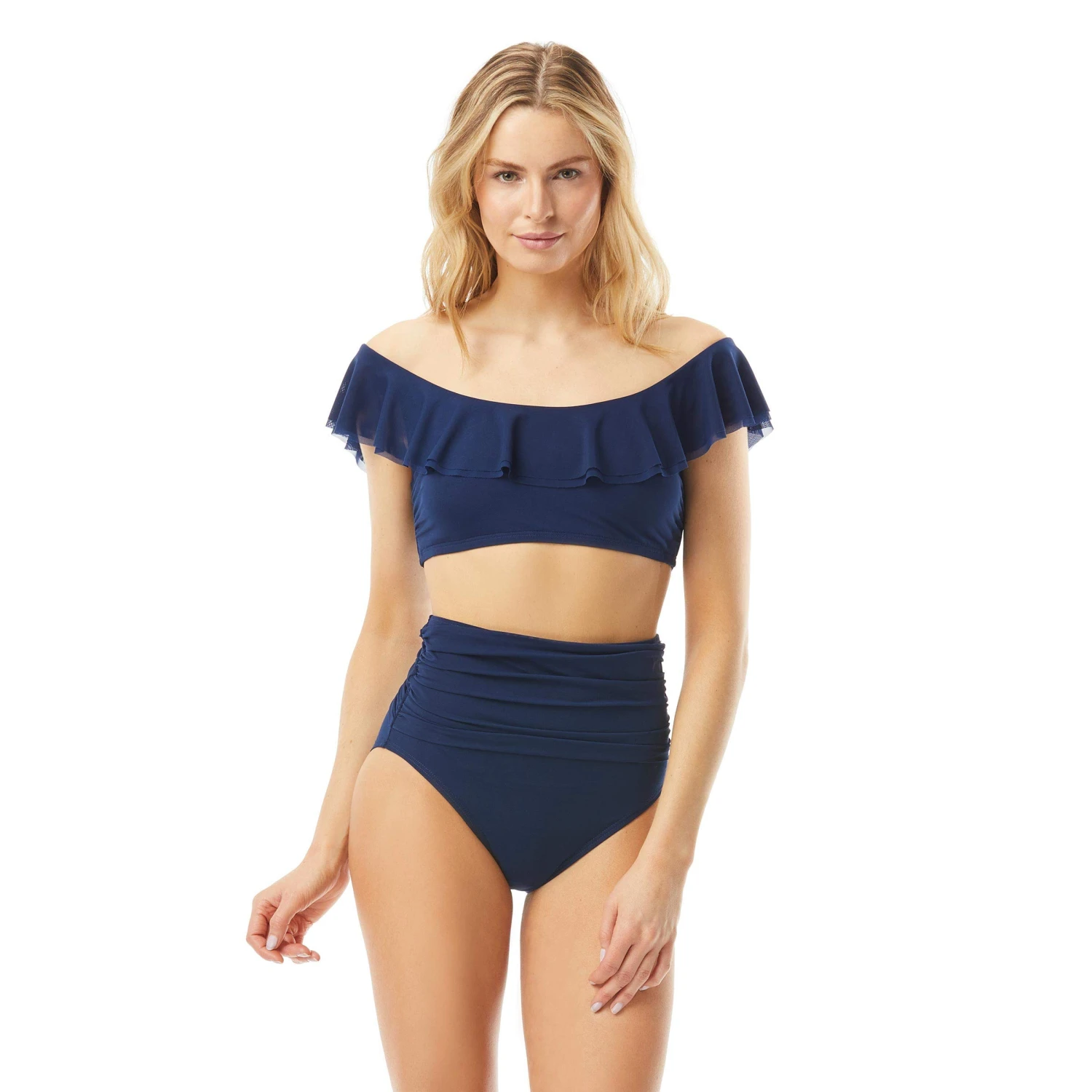 - Ruffle bikini top with scoop neck and mesh ruffle overlay. Top is an off the shoulder cut.