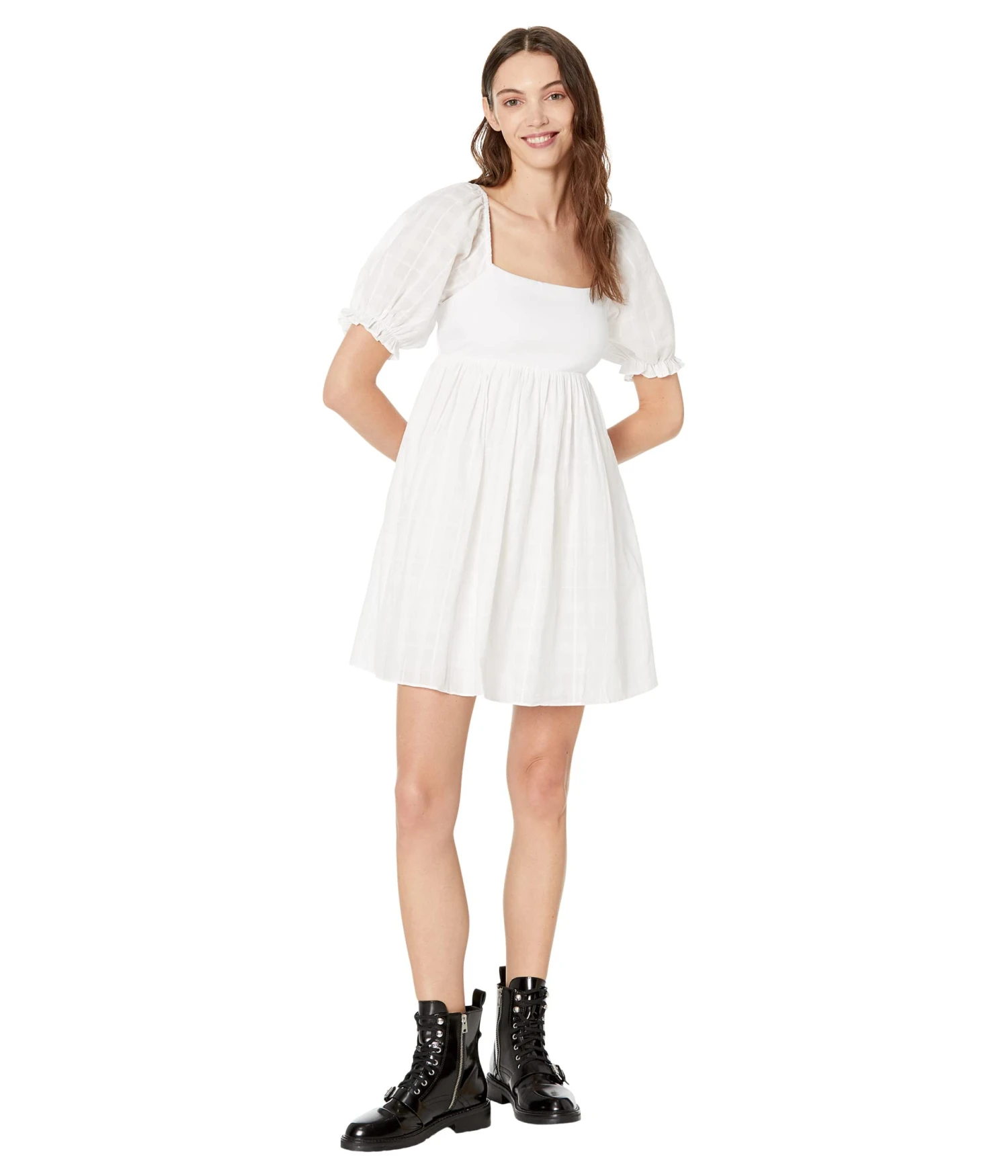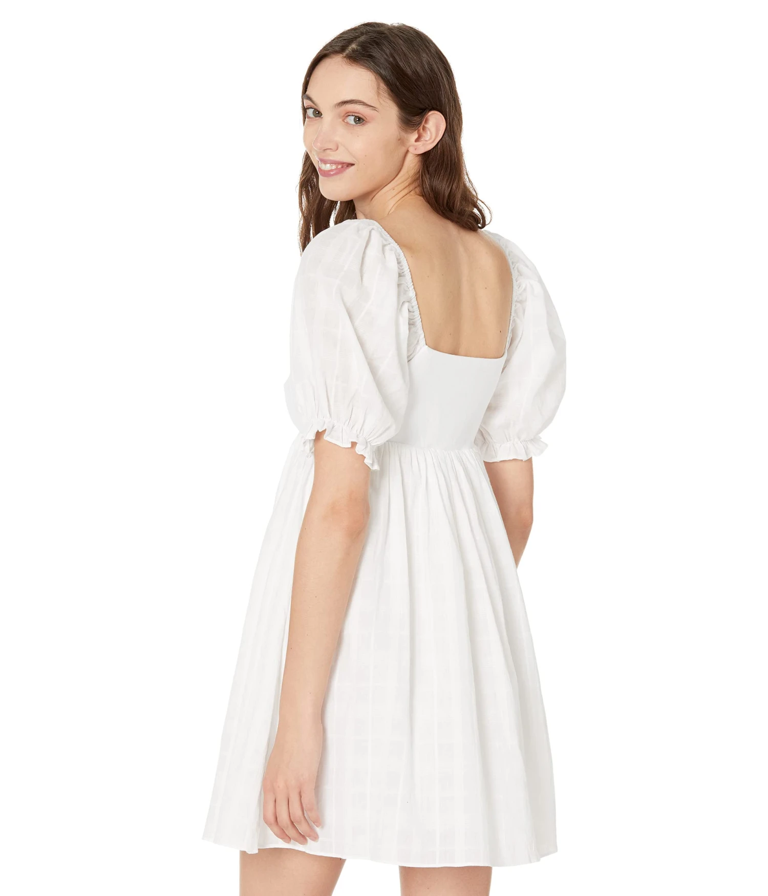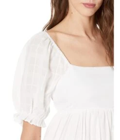 - Square neckline and short puffed sleeves.