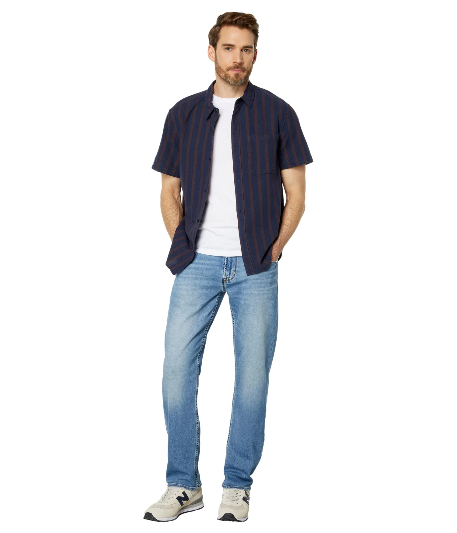 - Belt loop waist with buttoned front and a zip-fly closure.