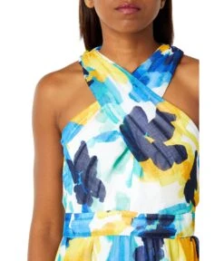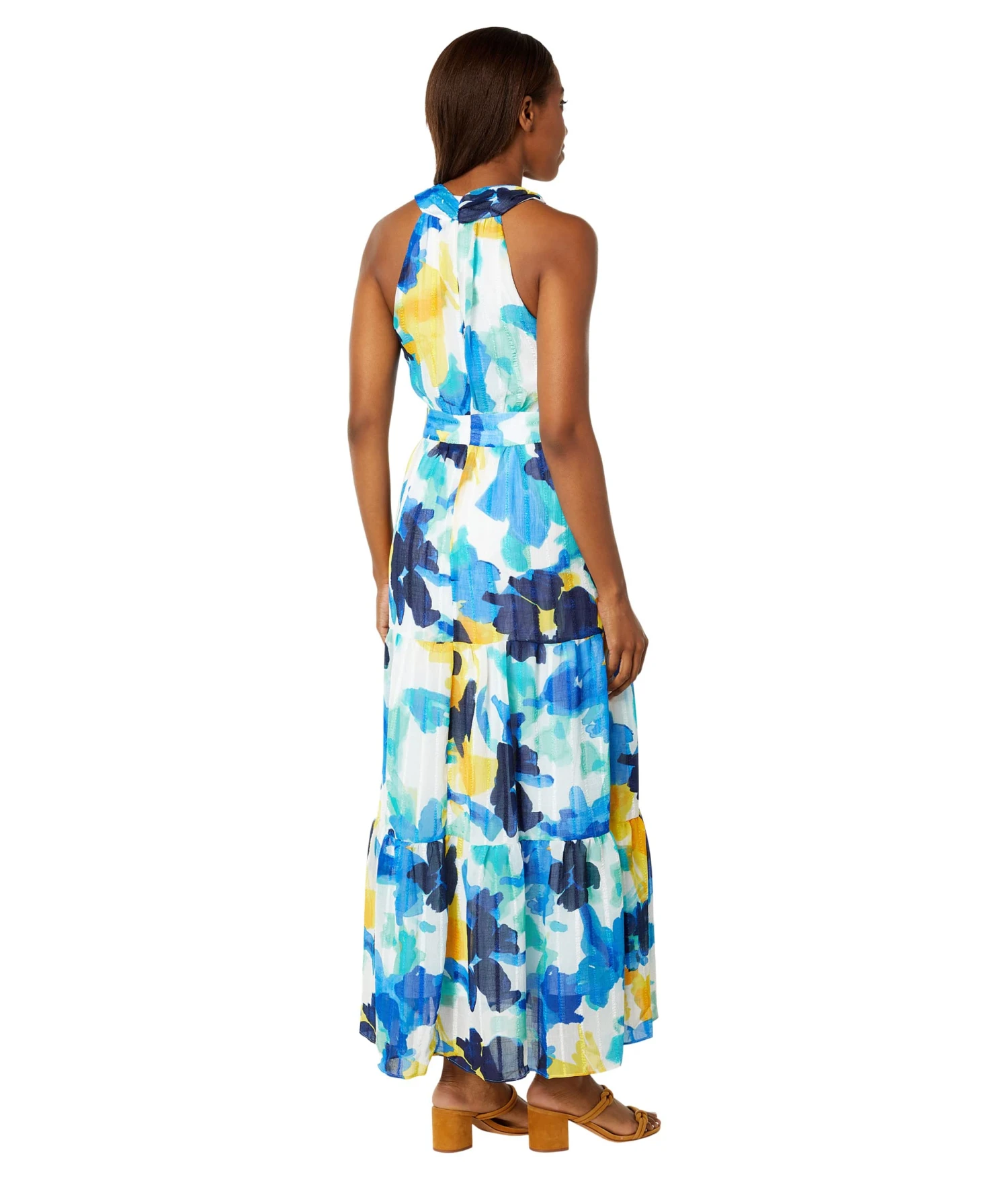 - Sleeveless dress with a halter neckline.