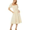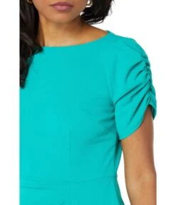 - Midi-length dress featuring classic crew neckline and short sleeves with gathered detailing.