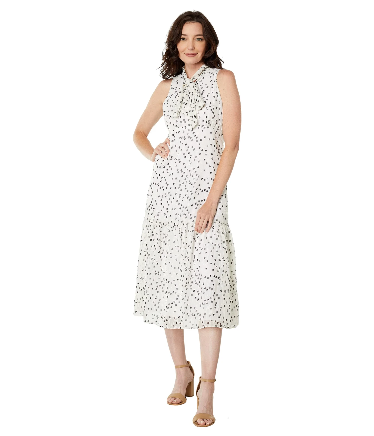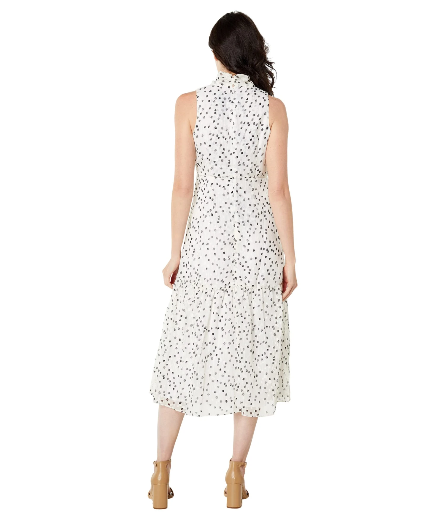 - Get ready for an eventful day wearing Maggy London™ Sleeveless Clip Dot Midi Dress.