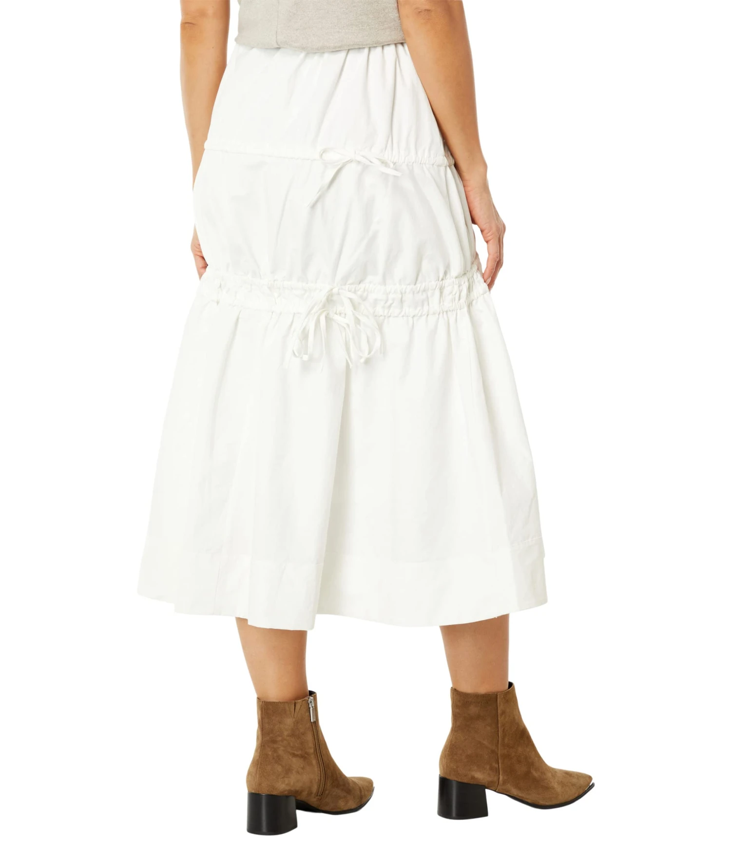- Tiered skirt with intricate tie-detailing.