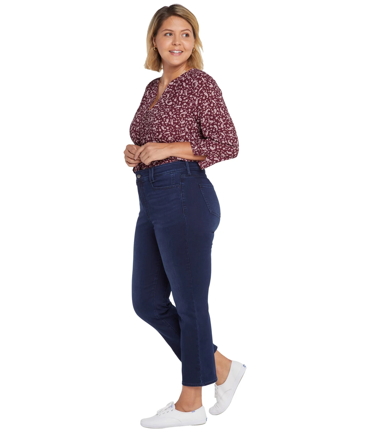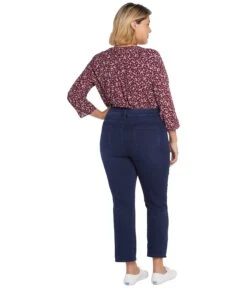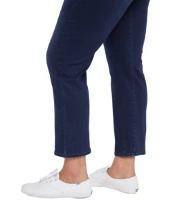 - The NYDJ® Plus Size ThighShaper™ Straight Ankle Jeans in Waterbury are a new design intended to slim and shape thighs with a high-stretch knit compression panel which some women report helps to aid in the reduction of inner-thigh rubbing. With their ankle length and flattering high-waisted silhouette, these jeans combine classic chic with fabulous fit. To enhance their shaping benefits, Future Fit Denim® provides additional all-over compression that may help even contours, and Lift Tuck® Technology uses a proprietary slimming panel with a patented crisscross design that may help to smooth and support curves. Finished with a zip fly and button closure, square front pockets with seam detail and back patch pockets.