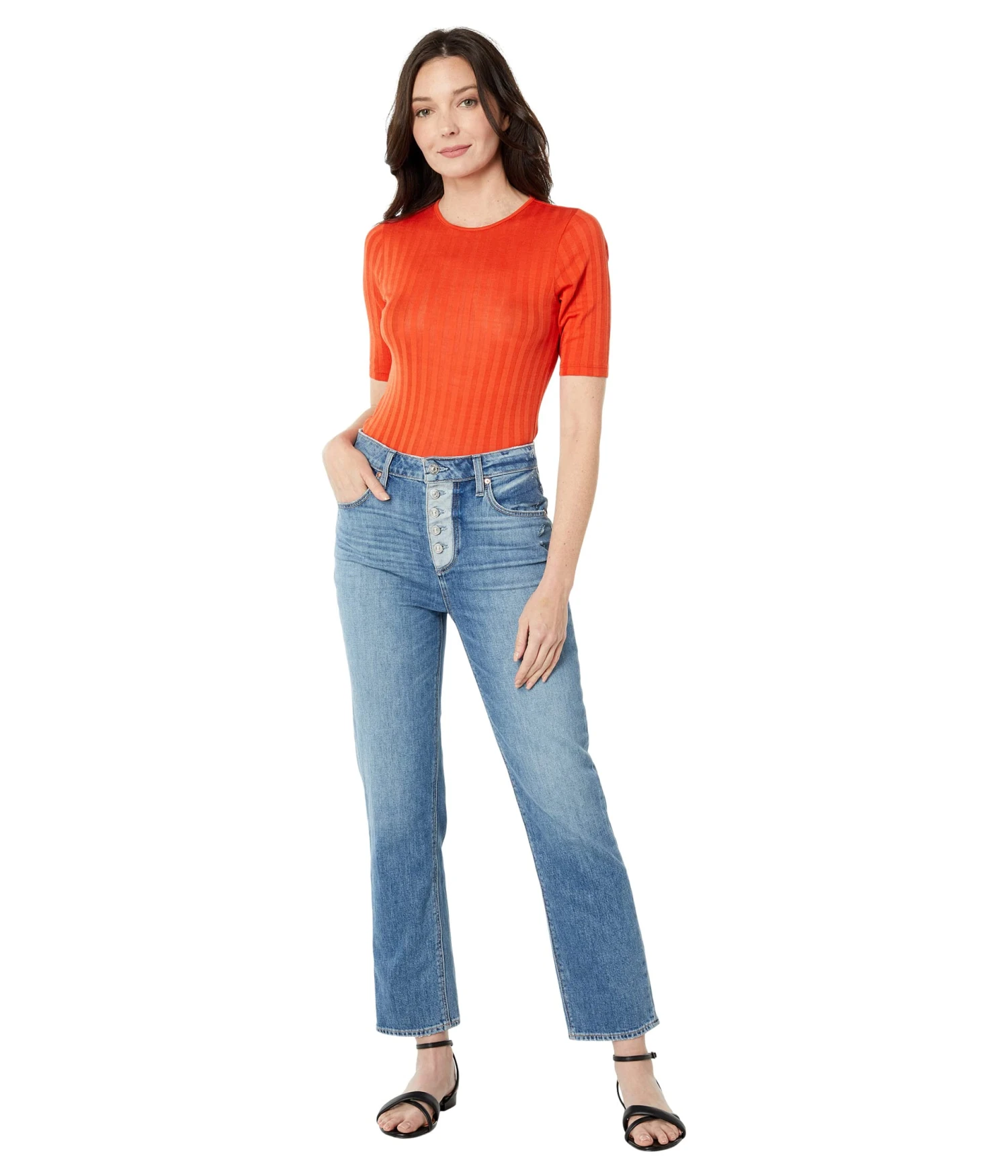 - Mid-rise, straight-leg jeans.