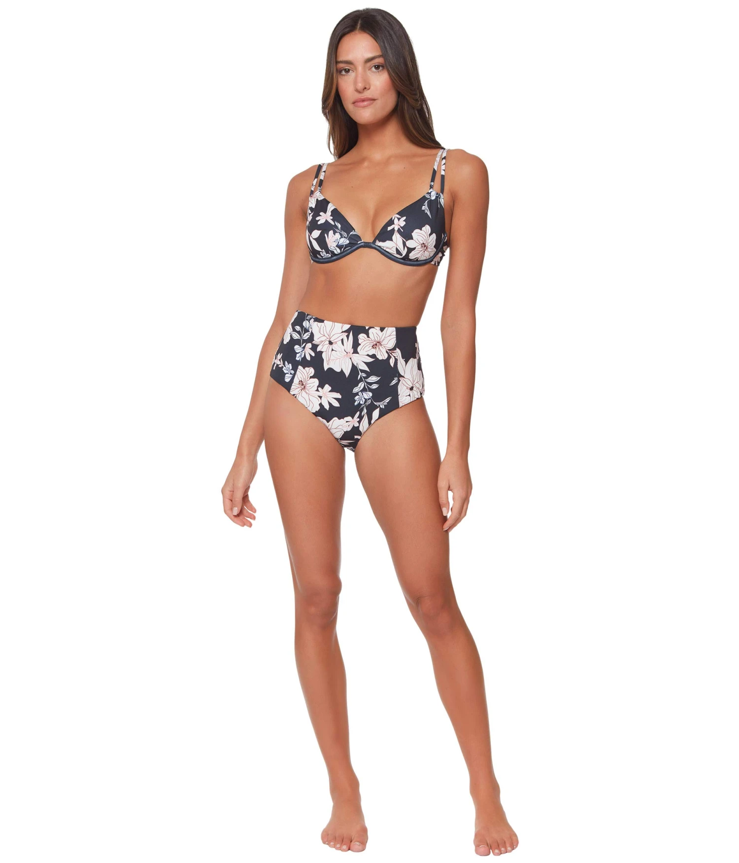 - Features underwire support, removable cups, adjustable double shoulder straps, and a hook and eye back closure.