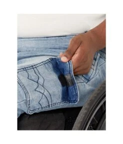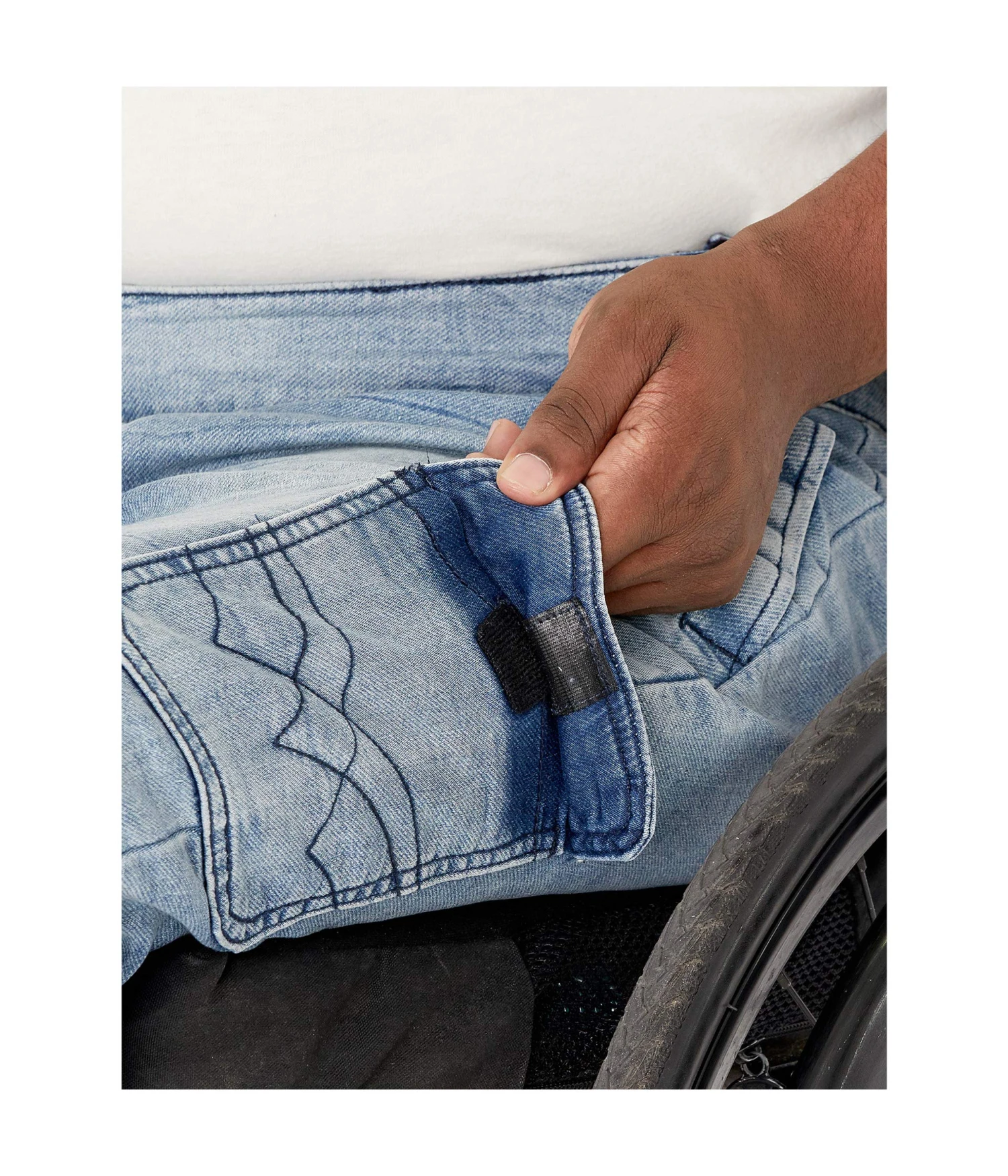 - The Seven7® able Seated Slim Straight Joggers are an ultra-cool jean that is sure to compliment your trendy wardrobe. Featuring a Velcro® closure at the side for easy on and off as well as a Velcro® thigh pocket for access while seated. These adaptive jeans make dressing a breeze for people who use wheelchairs.