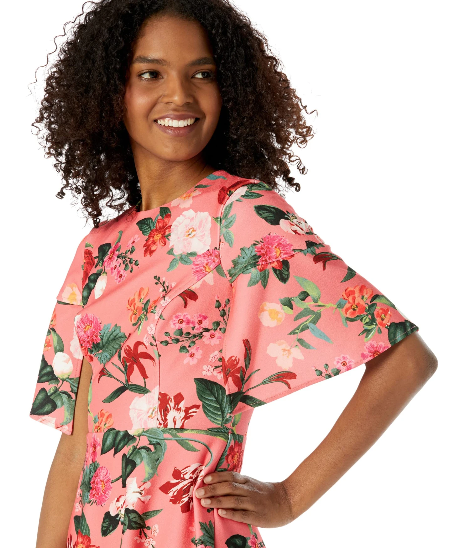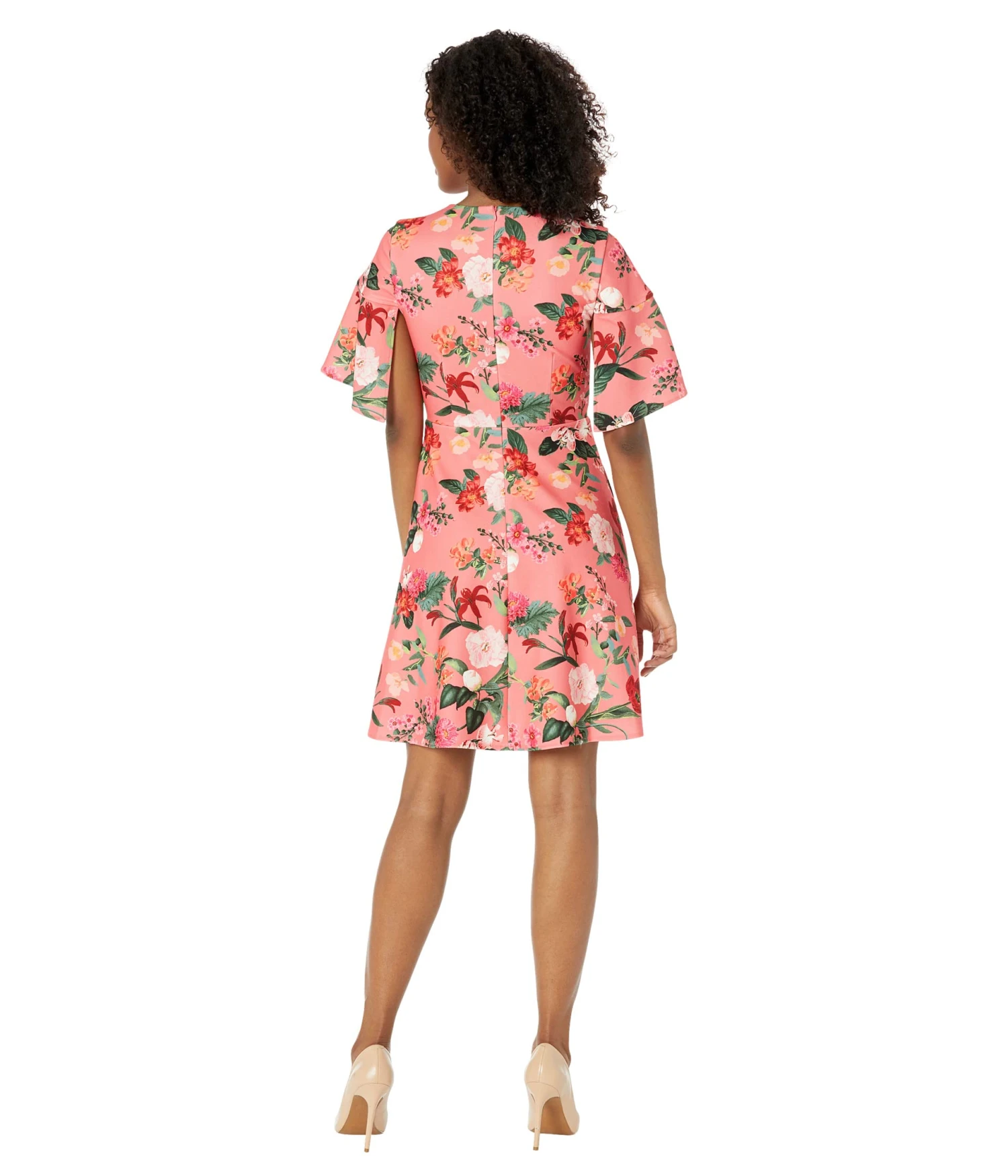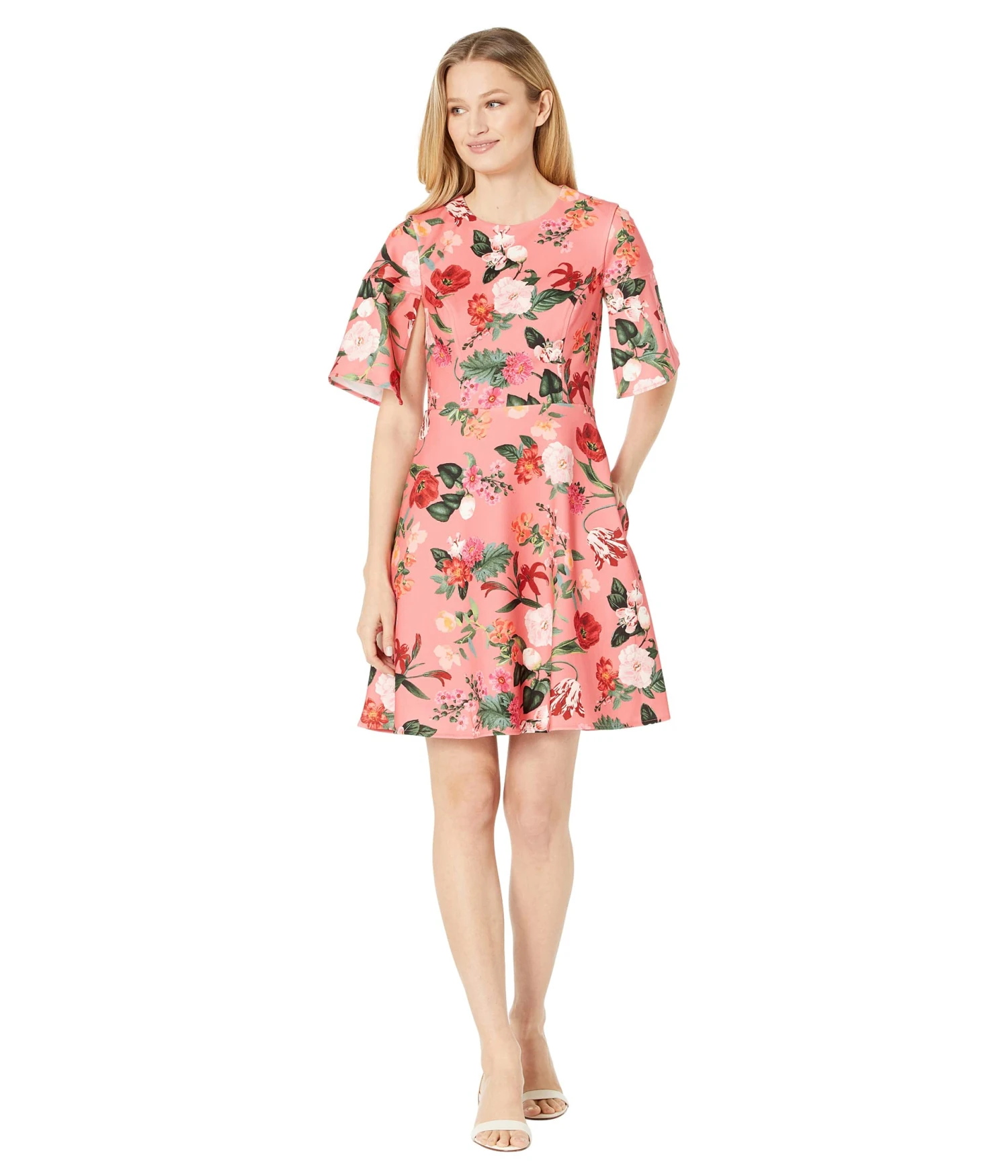 - Dress beautifully in warm days wearing the delightful floral print Vince Camuto® Scuba Crepe Split Flutter Sleeve Fit-and-Flare dress.