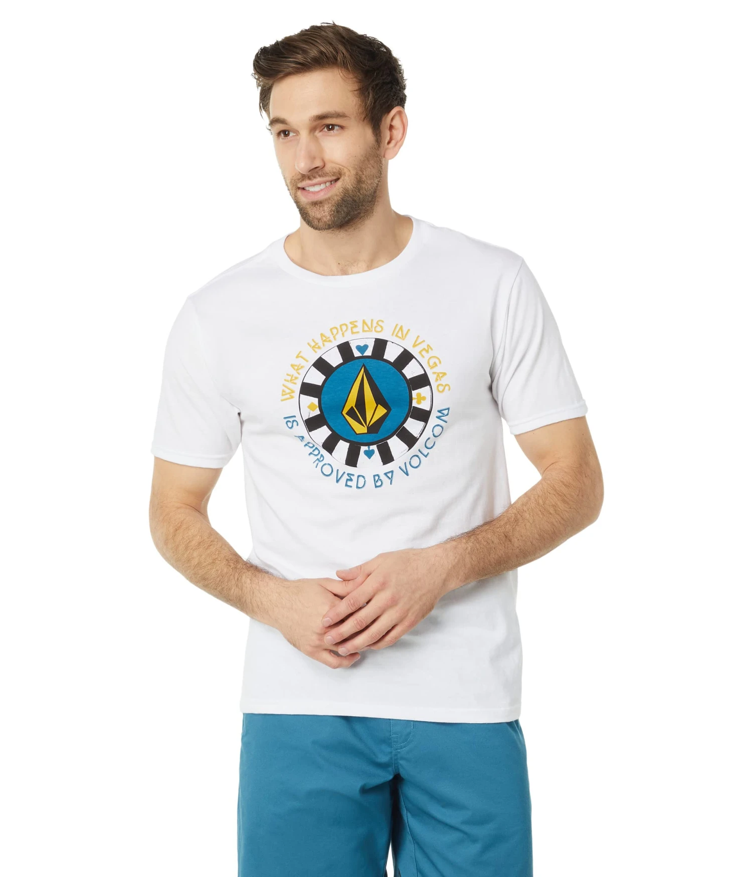 - Exude a fun persona, wearing the Volcom® Las Vegas Short Sleeve Tee, featuring a quirky print.